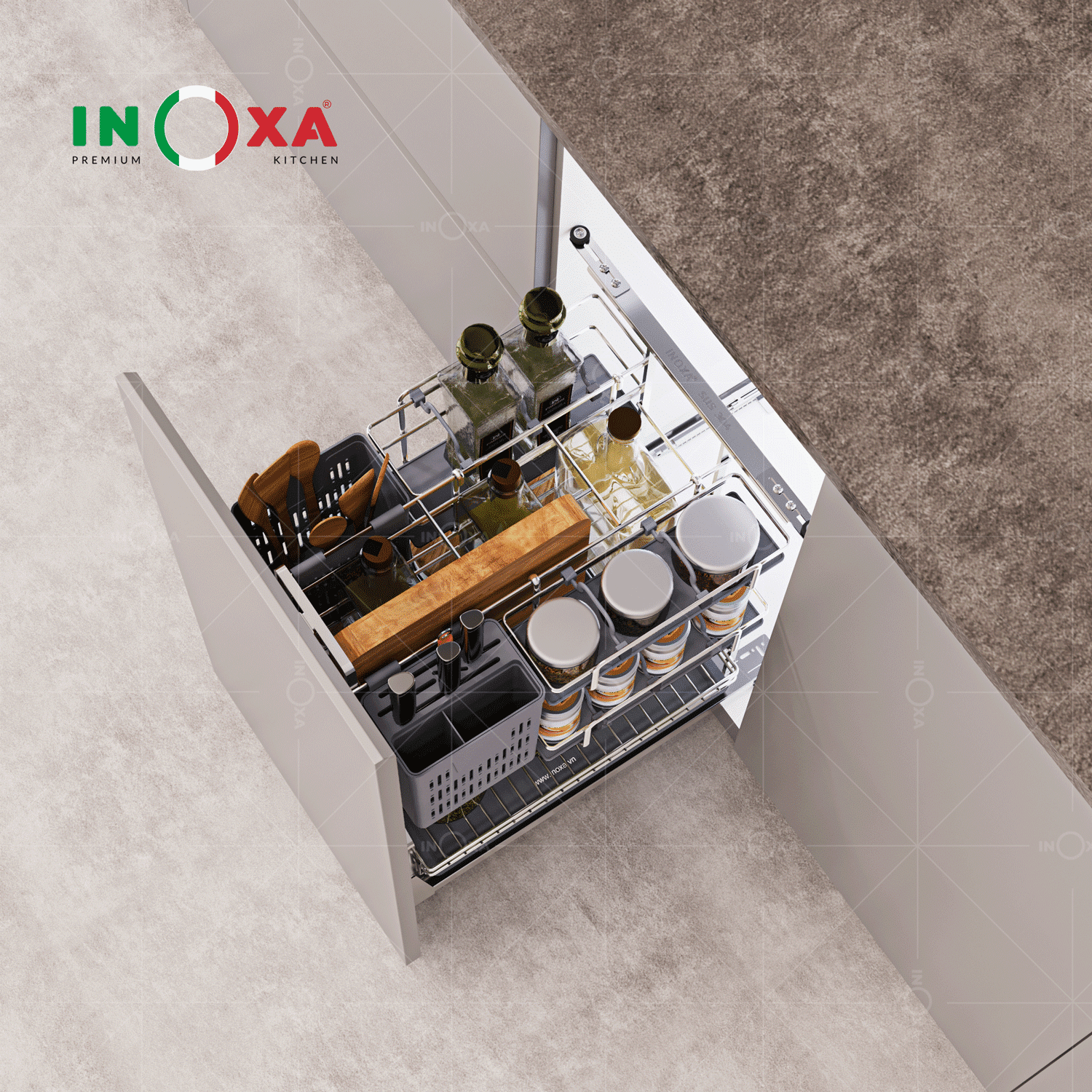 Giá bát đĩa nâng hạ thông minh cho tủ bếp hiện đại
