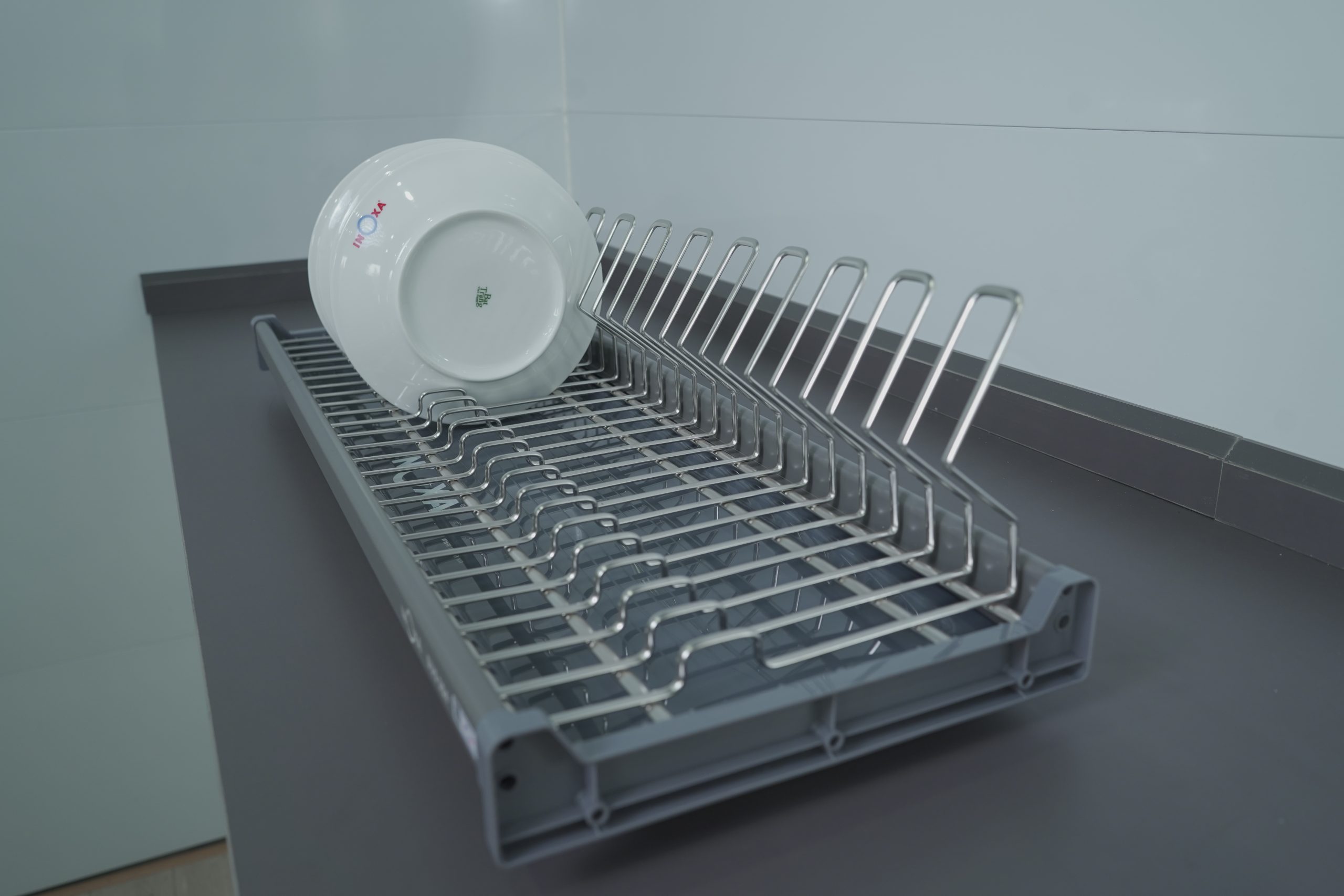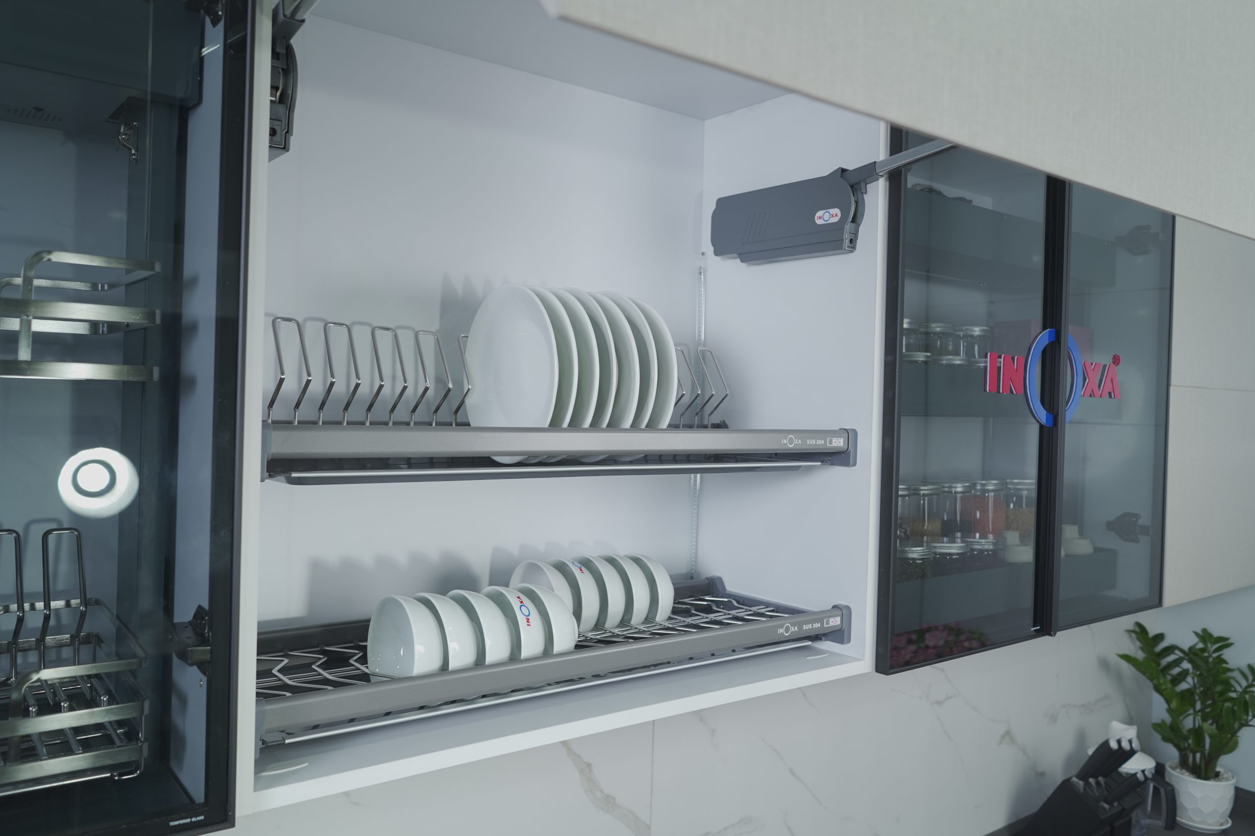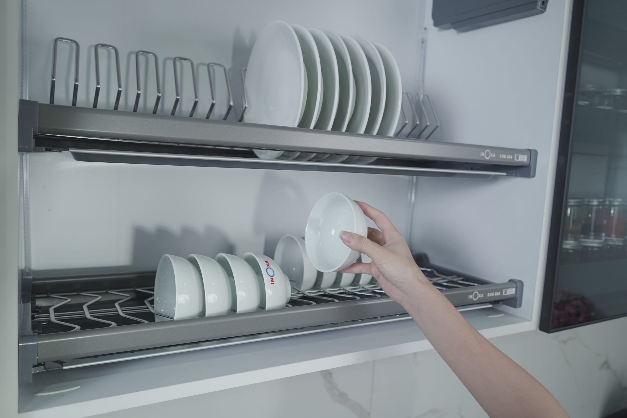 Cấu trúc hai tầng được bố trí khoa học theo triết lý High Performance Space Design – nguyên lý thiết kế đặc trưng của INOXA. Tầng trên sử dụng sàn úp bát dạng sóng công năng, giúp cố định bát chắc chắn và thoát nước nhanh. Tầng dưới được thiết kế dạng cánh hiện đại, mở rộng không gian chứa đĩa, tăng khả năng sắp xếp gọn gàng và thuận tiện khi sử dụng. Toàn bộ hệ giỏ không chỉ đáp ứng nhu cầu lưu trữ hiệu quả mà còn góp phần tạo nên tổng thể tinh gọn, đồng bộ cho hệ tủ bếp cao cấp của INOXA.