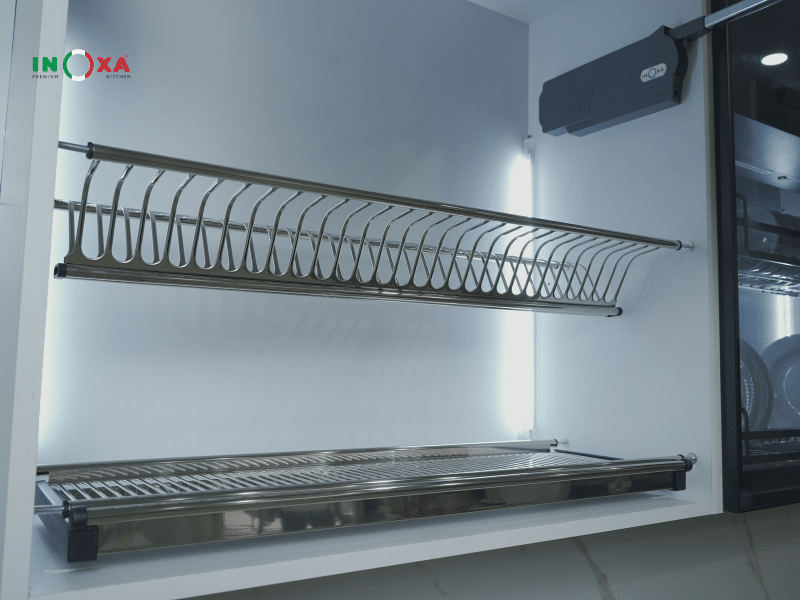Sản phẩm được thiết kế với 2 sàn lưu trữ chính, đáp ứng tốt nhu cầu sắp xếp bát đĩa cơ bản trong tủ bếp trên. Khoảng cách giữa các tầng được tính toán để thao tác thuận tiện, không gây vướng khi lấy hoặc cất đồ.