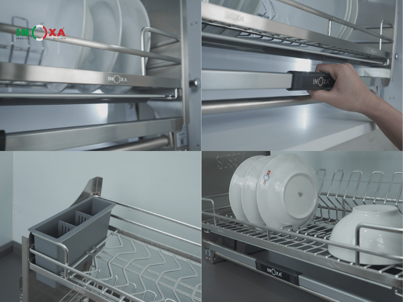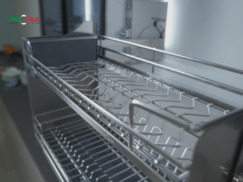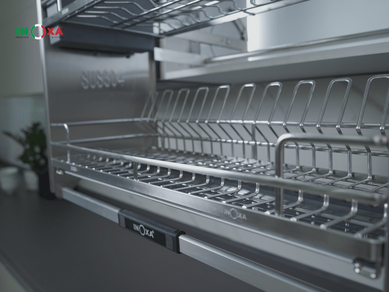 Với cấu trúc tháo lắp linh hoạt, người dùng có thể dễ dàng vệ sinh định kỳ, duy trì sự thông thoáng và đảm bảo tiêu chuẩn vệ sinh cho không gian lưu trữ bát đĩa. Dù là một chi tiết nhỏ, khay hứng nước đã thể hiện rõ triết lý thiết kế chú trọng độ bền và trải nghiệm sử dụng của INOXA trong từng sản phẩm phụ kiện tủ bếp cao cấp.