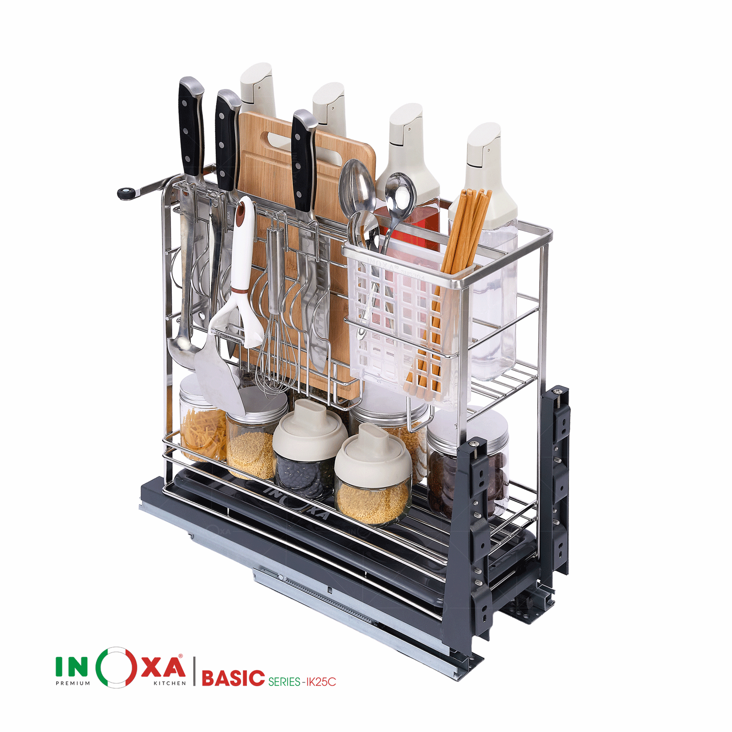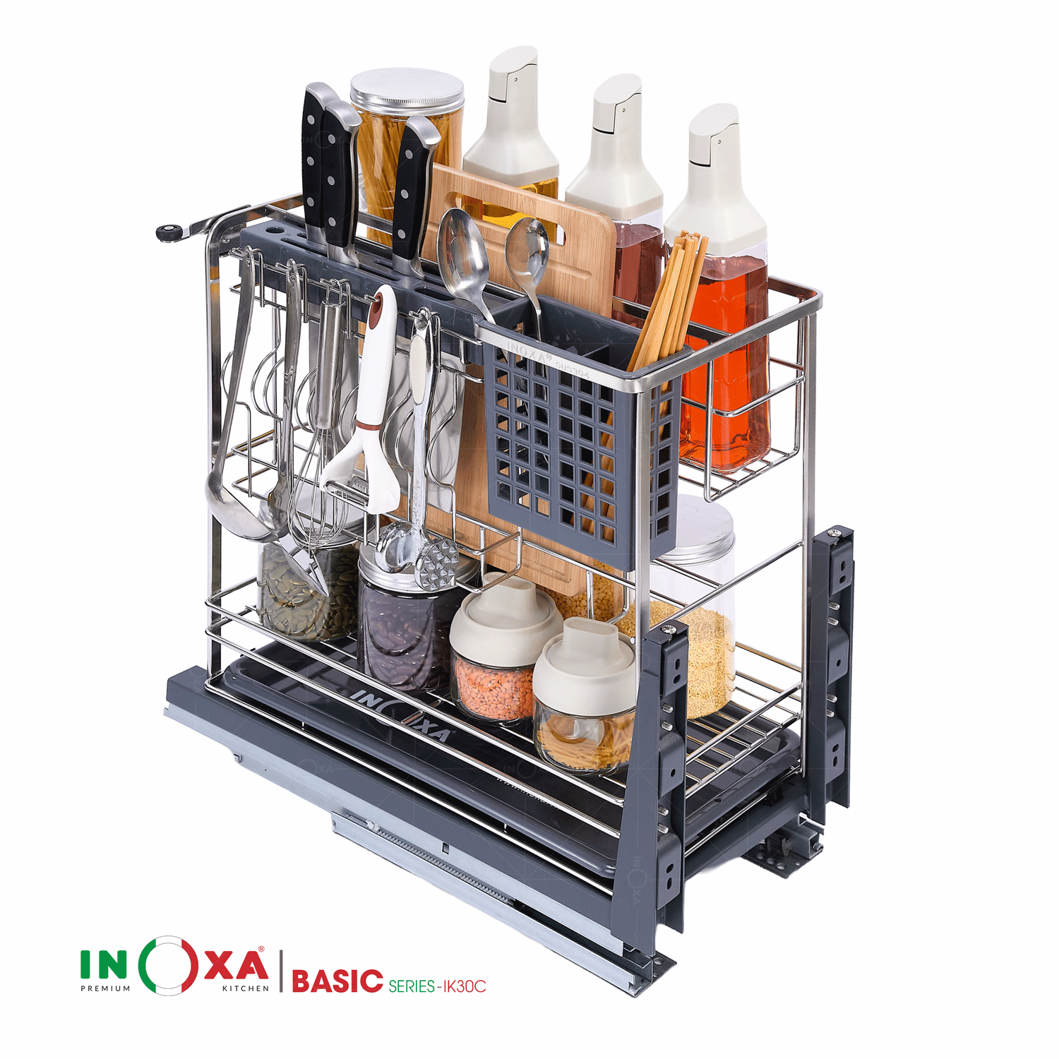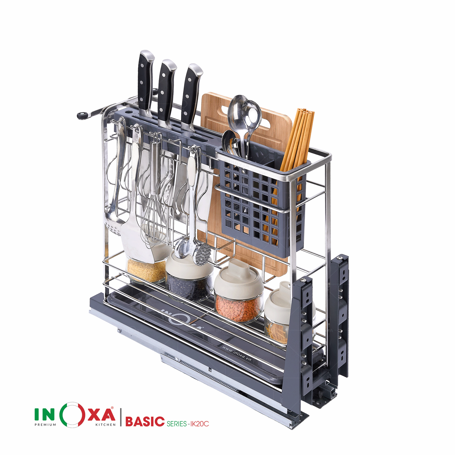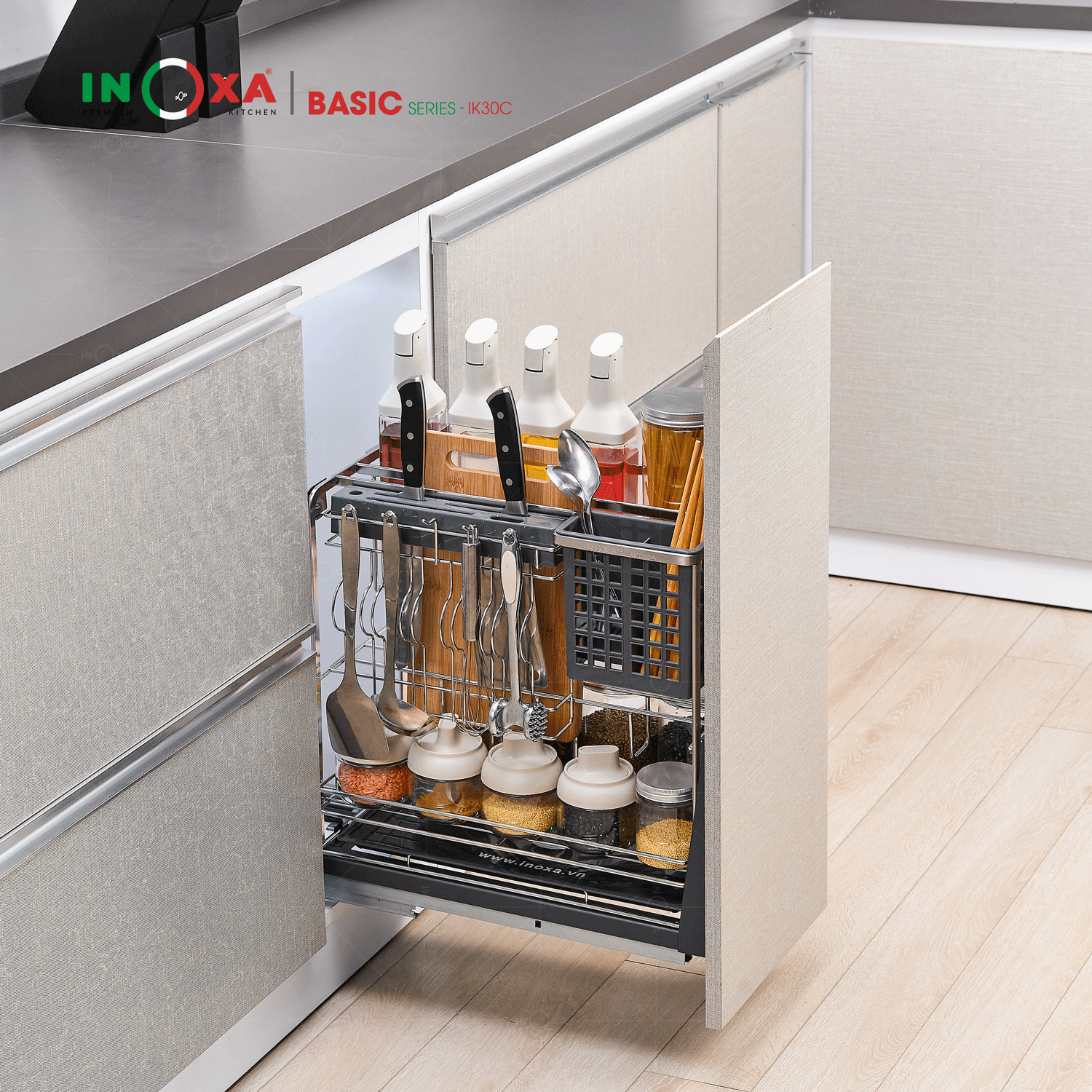 Giá dao thớt được trang bị ray âm giảm chấn Inoxa Slide cao cấp, cho khả năng chịu tải lên tới 30kg, phù hợp với đặc thù lưu trữ dao, thớt và nhiều dụng cụ nặng khác trong cùng một khoang.