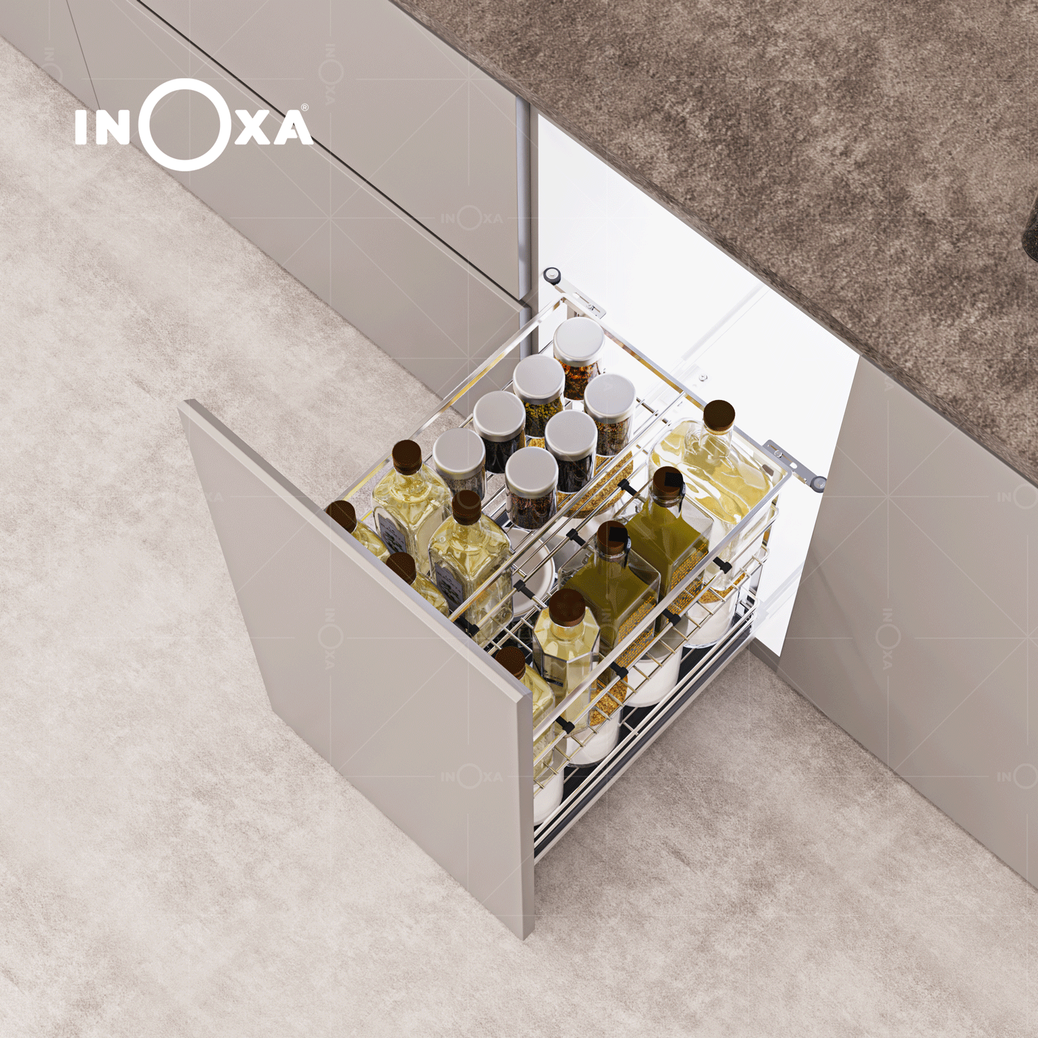 Thiết kế tối ưu cho tủ bếp dưới giúp người dùng sắp xếp gia vị tập trung, quan sát rõ ràng và lấy cất nhanh chóng ngay trong khu vực thao tác chính. Không chỉ là một phụ kiện nhà bếp đơn giản, giá gia vị inox nan dẹt còn góp phần tạo nên một không gian bếp ngăn nắp, mạch lạc và phù hợp với phong cách nhà bếp hiện đại mà INOXA đang theo đuổi.