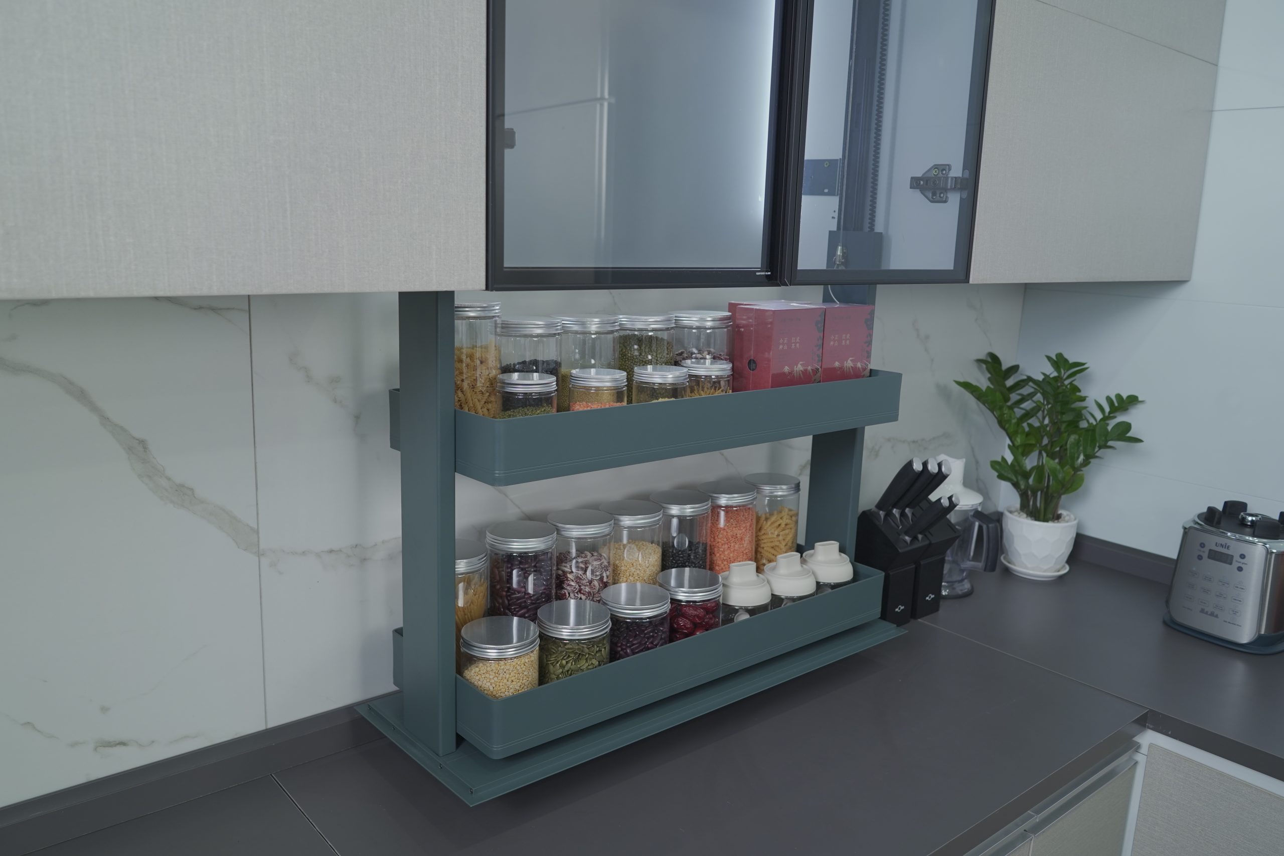 Giá gia vị nâng hạ điện INOXA được trang bị hai giỏ lưu trữ cao cấp, sử dụng vật liệu Fluorocarbon Aluminum (hợp kim nhôm carbon) kết hợp cùng kính cường lực Tempered Glass, tạo nên tổng thể vừa bền chắc vừa tinh tế. Sự phối hợp giữa kim loại xử lý bề mặt cao cấp và kính trong suốt mang lại cảm giác nhẹ nhàng, hiện đại, đồng thời nâng cao giá trị thẩm mỹ cho khu vực tủ bếp trên.