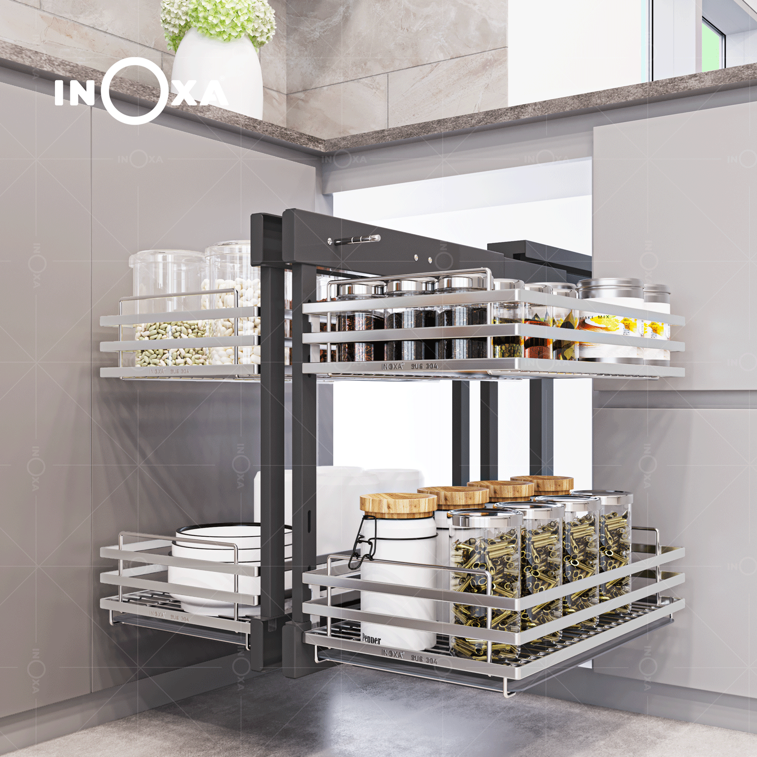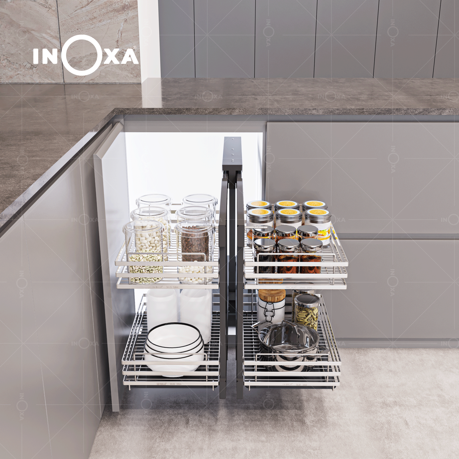 Giá góc liên hoàn mở toàn phần inox nan dẹt của INOXA cho phép toàn bộ hệ giỏ được kéo ra ngoài hoàn toàn, giúp người dùng tiếp cận trực tiếp mọi vật dụng chỉ trong một thao tác. Sự kết hợp giữa kết cấu mở linh hoạt, hệ ray trượt ổn định và giỏ inox nan dẹt chịu lực cao tạo nên một giải pháp lưu trữ góc gọn gàng, trực quan và phù hợp với nhịp sử dụng bếp hiện đại.