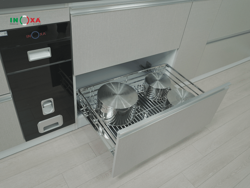 Điểm mạnh của giá xoong nồi inox Oval nằm ở tính tiện dụng và khả năng tối ưu không gian. Sản phẩm thường được lắp đặt trong tủ bếp dưới, với hệ ray trượt giảm chấn cao cấp giúp thao tác nhẹ nhàng, êm ái và không gây tiếng ồn. Người dùng chỉ cần kéo nhẹ là toàn bộ không gian lưu trữ được mở ra, thuận tiện cho việc sắp xếp và tìm kiếm dụng cụ nấu nướng.