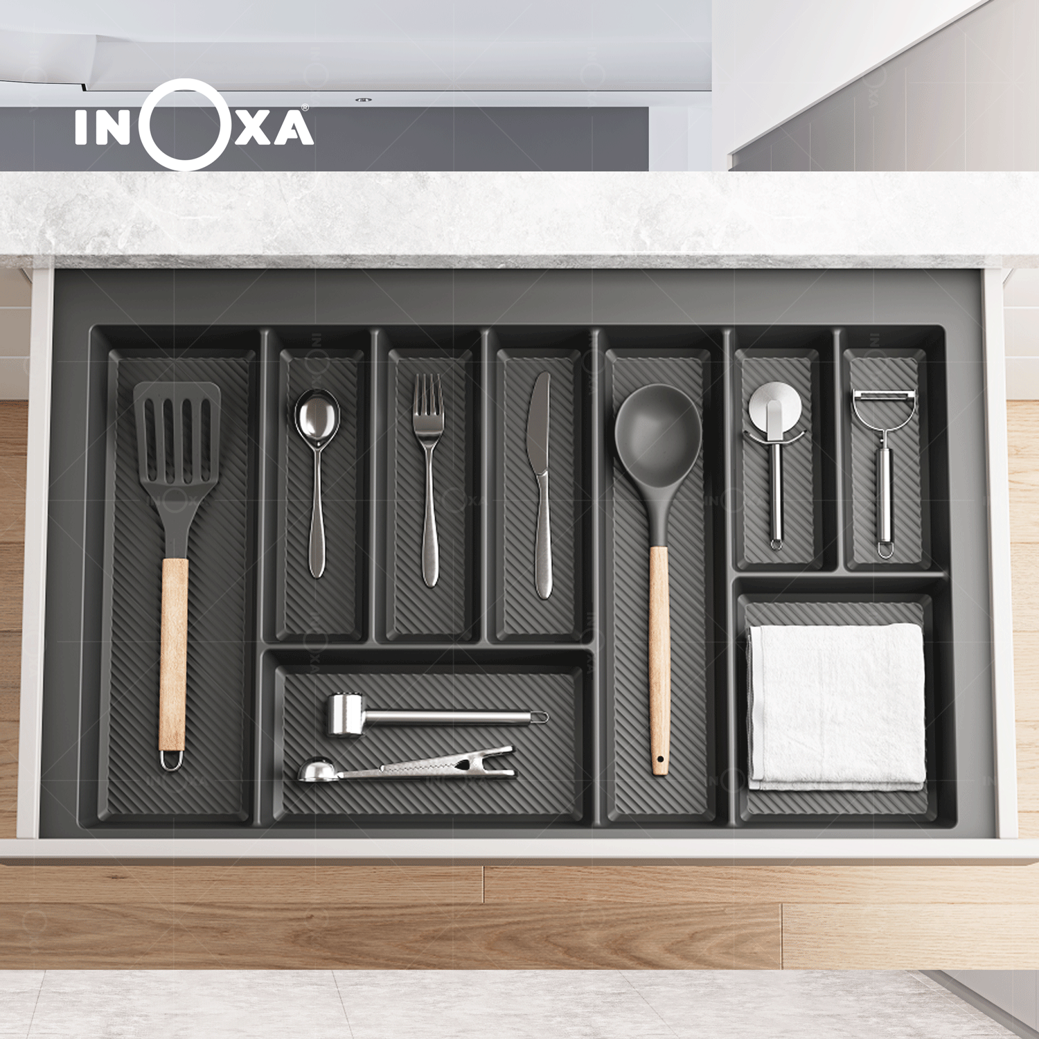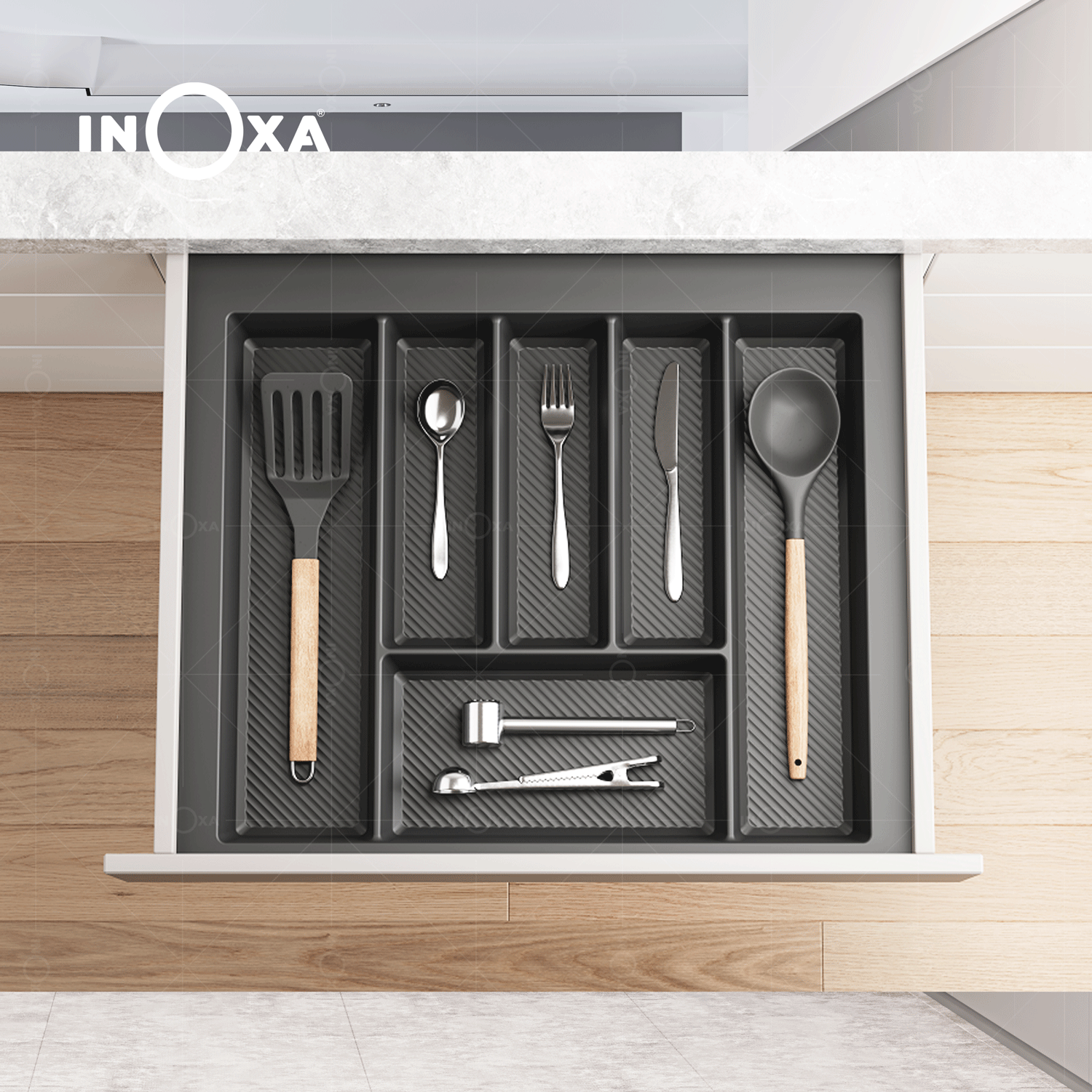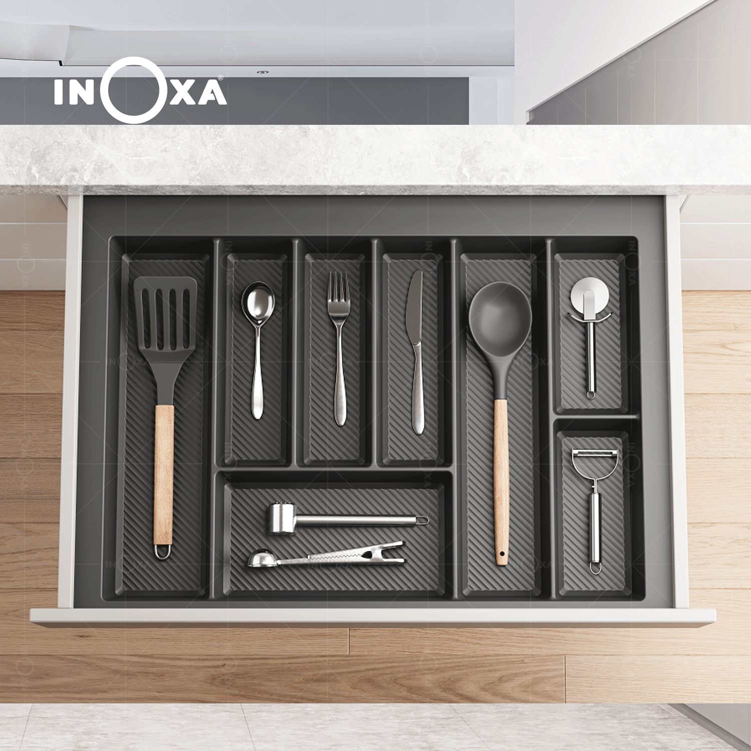 INOXA cung cấp dòng khay chia nhựa với dải kích thước rộng, từ các khoang tủ nhỏ W550mm đến các khoang tủ lớn W850mm. Chiều sâu tiêu chuẩn D490mm giúp sản phẩm tương thích hoàn hảo với hầu hết các hệ ngăn kéo hiện đại trên thị trường.